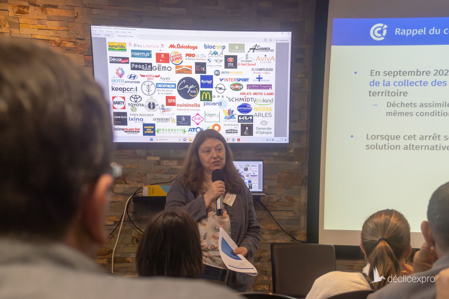 Mme Mandy Graillon, et Mme Christelle Castell, CCIPA chargée de mission, ont ensuite pris tour à tour la parole. Les premiers résultats de l’enquête « Collecte des déchets dans les ZAE de l’ACCM » se sont dévoilés. Mme Graillon a souligné l’importance du tri sélectif. En effet, chez la plupart des commerçants, la majorité des déchets sont aujourd’hui valorisables (carton, plastique). Afin de faciliter le tri, des bacs de tris seront mis à disposition de ceux qui en font la demande.